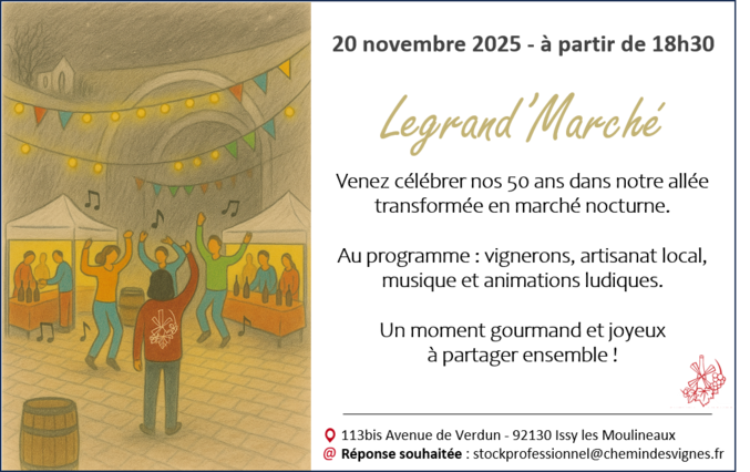 Pour célébrer dignement ces 50 années, nous vous offrons 15% de réduction sur tous les vins et produits en dégustation toute la soirée ! C'est l'occasion idéale de découvrir et d'emporter ces pépites que vous aurez dégustées.