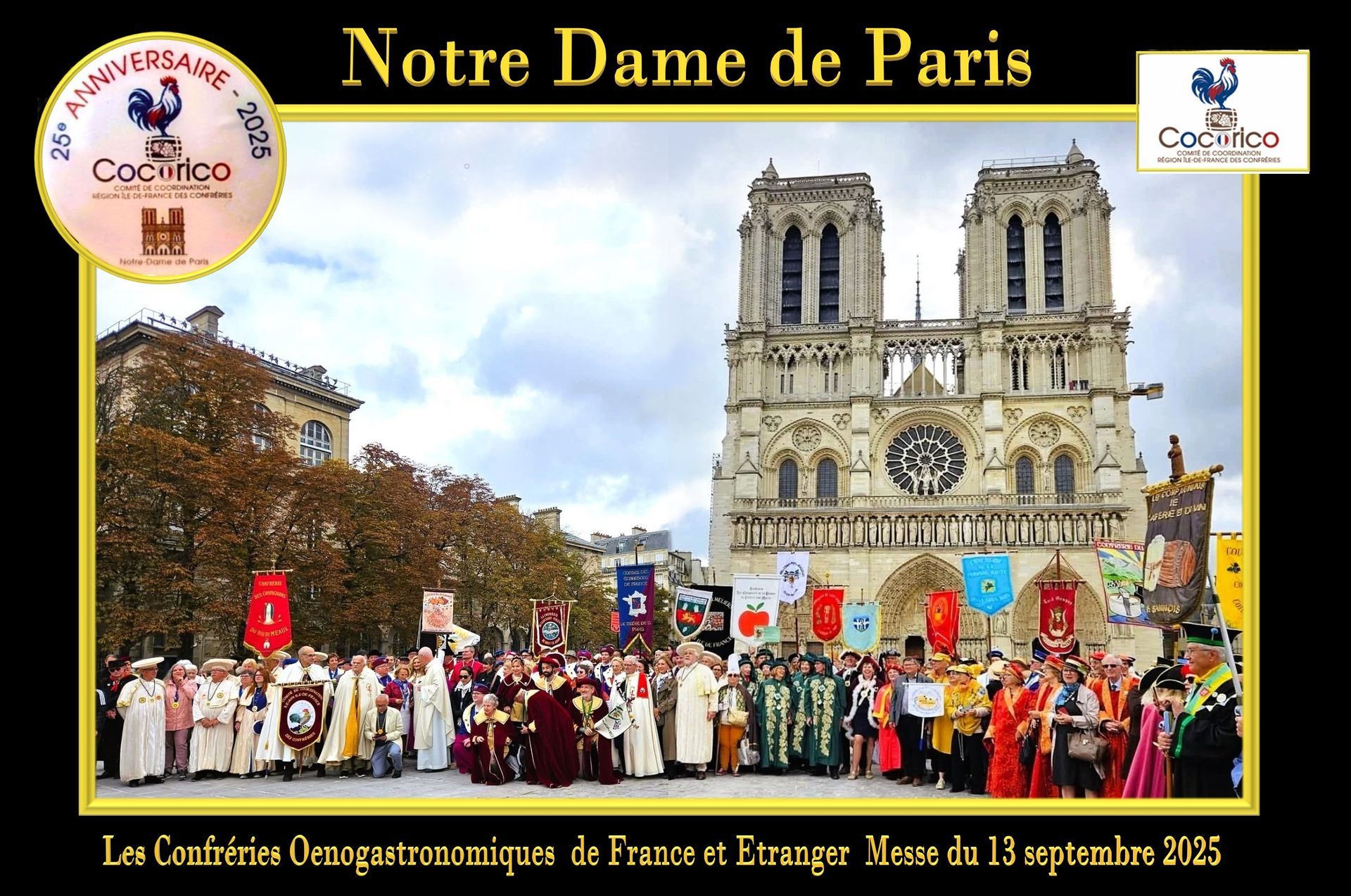 Le Comité de Coordination Région Ile de France des Confréries - COCORICO - dont nous faisons partie, a organisé un grand rassemblement des confréries avec, comme point d’orgue, une grand messe solennelle à Notre-Dame de Paris. Plusieurs dizaines de Confréries, sans doute un millier de confrères et de consoeurs, en grandes tenues, se sont retrouvés à Notre-Dame de Paris, venant de partout en France, de Suisse, du Luxembourg, de Belgique et même des Etats-Unis.